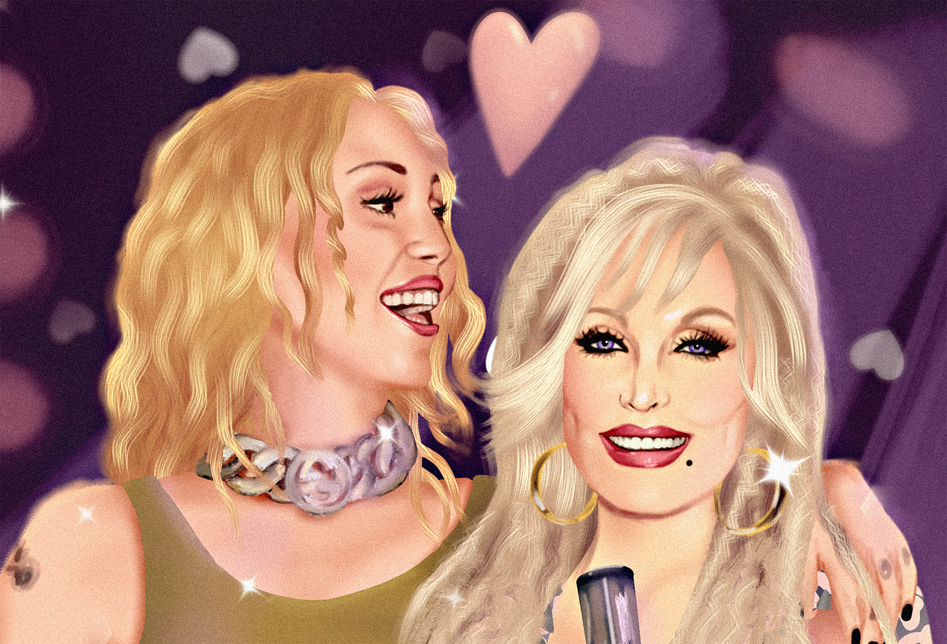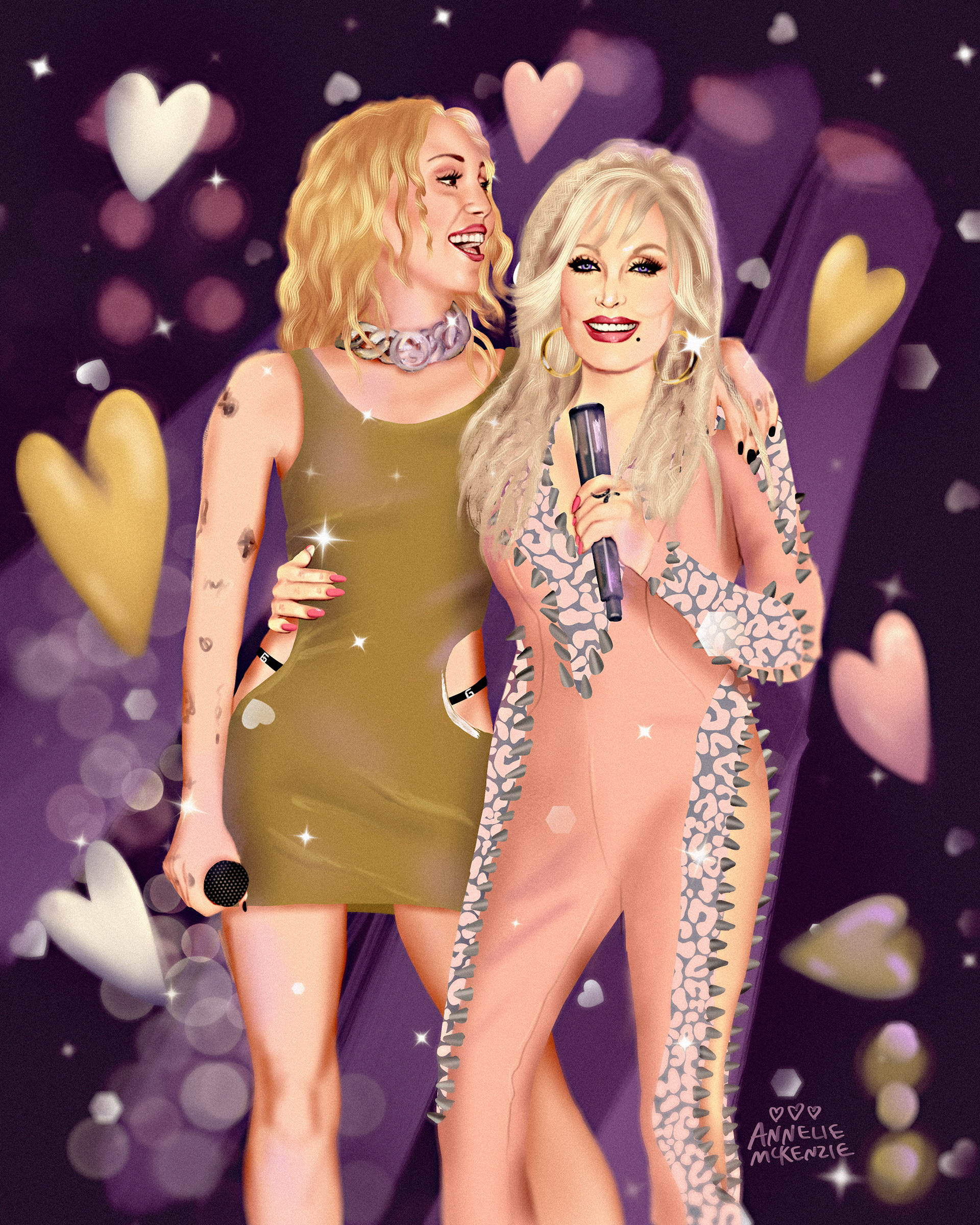 Miley Cyrus and Dolly Parton on stage together in a digital painting. A portrait illustration of two figures.